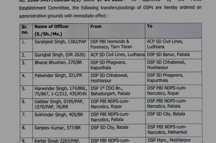 Featured Headlines Punjab News Punjab Police News Transfers in Punjab 129 DSPs Transferred in Punjab April 17, 2026