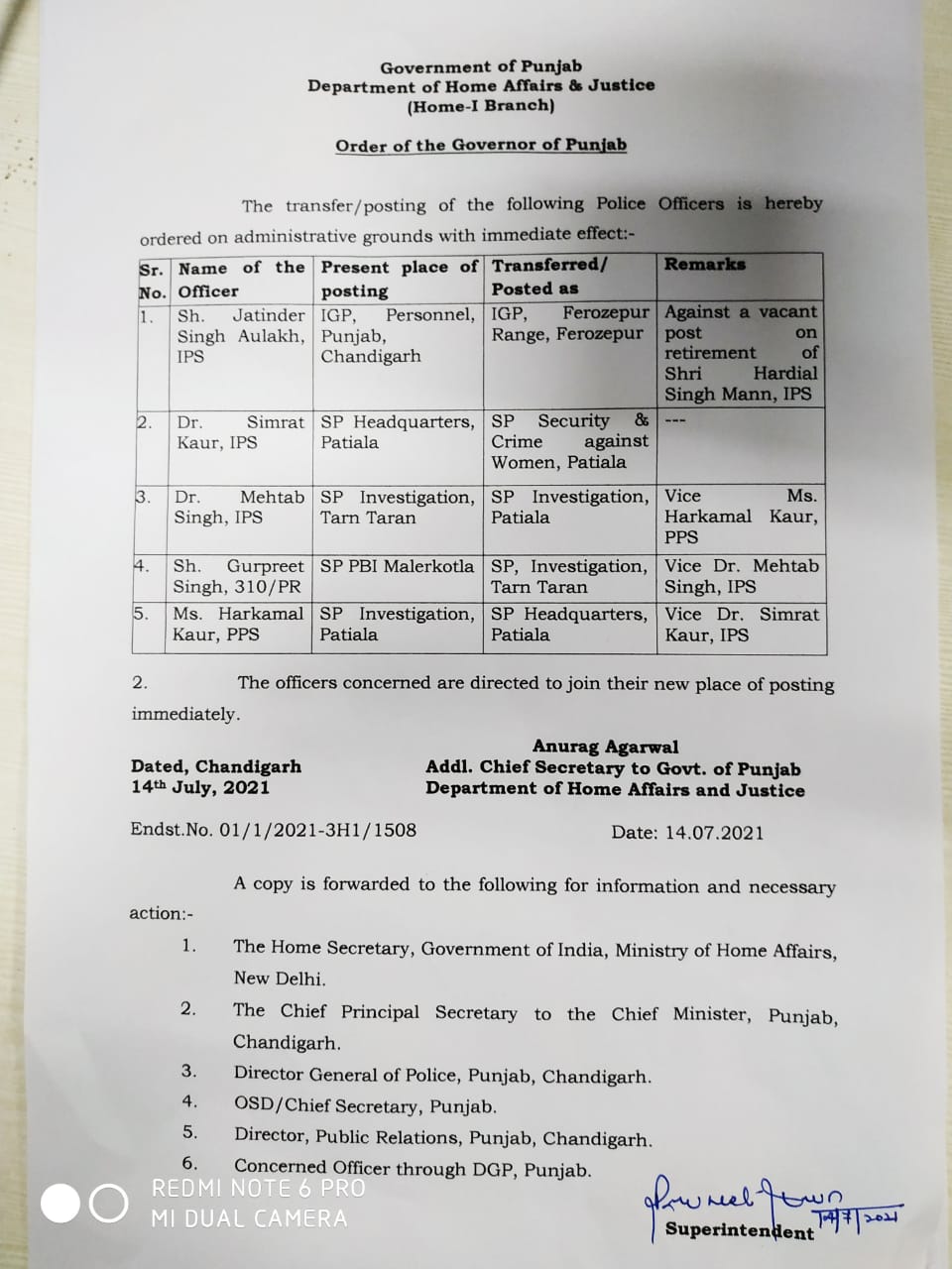 5 Punjab Police IPS PPS officers transferred July 14, 2021 - PatialaPolitics SHARE ON TwitterFacebookGoogle+BufferLinkedInPin It Post Views: 0