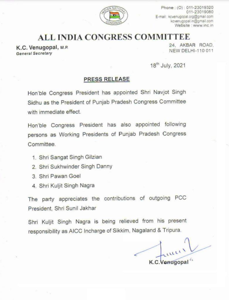 AICC President Sonia Gandhi appoints Navjot Singh Sidhu as the President of the Punjab Pradesh Congress Committee with immediate effect