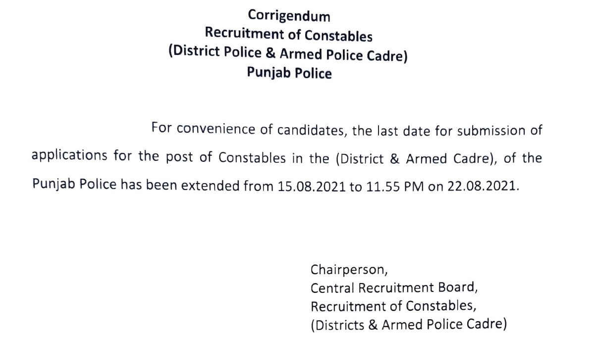 Punjab Police Constable Recruitment 2021 date extended August 17, 2021 - PatialaPolitics SHARE ON TwitterFacebookGoogle+BufferLinkedInPin It Post Views: 0