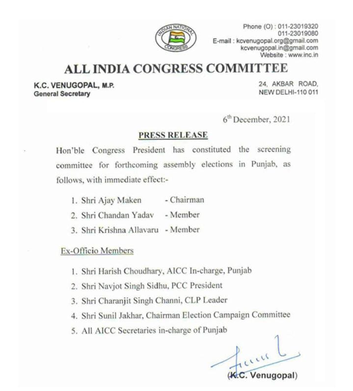 Congress forms screening committee for Punjab 2022 polls