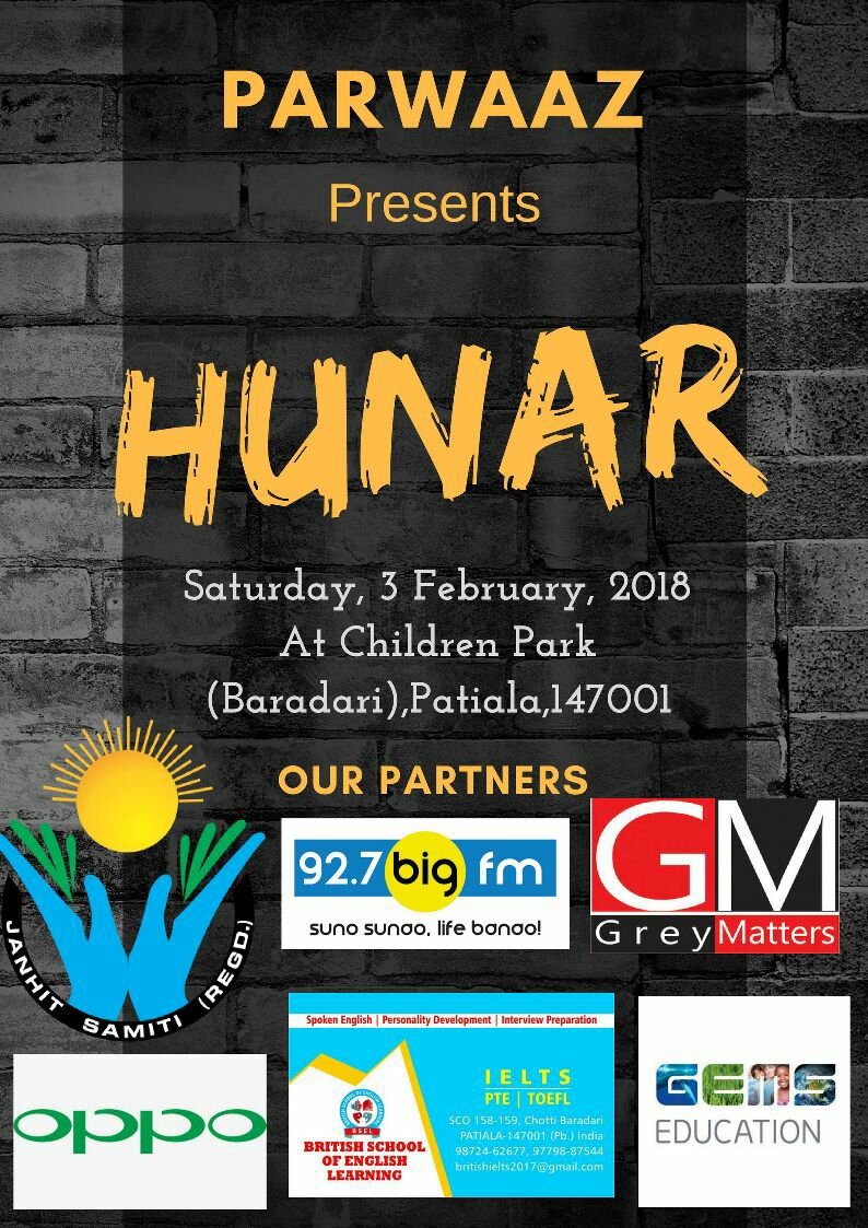 A social event namely “Hunar” is being organized by PARWAAZ a social NGO on Feb 3 2018 at children’s park , Baradari Garden., Patiala. from 11.am to 4pm. It is an event where underprivileged kids aging from 5 to 15 are given a stage to show their talent through different type of talent shows.