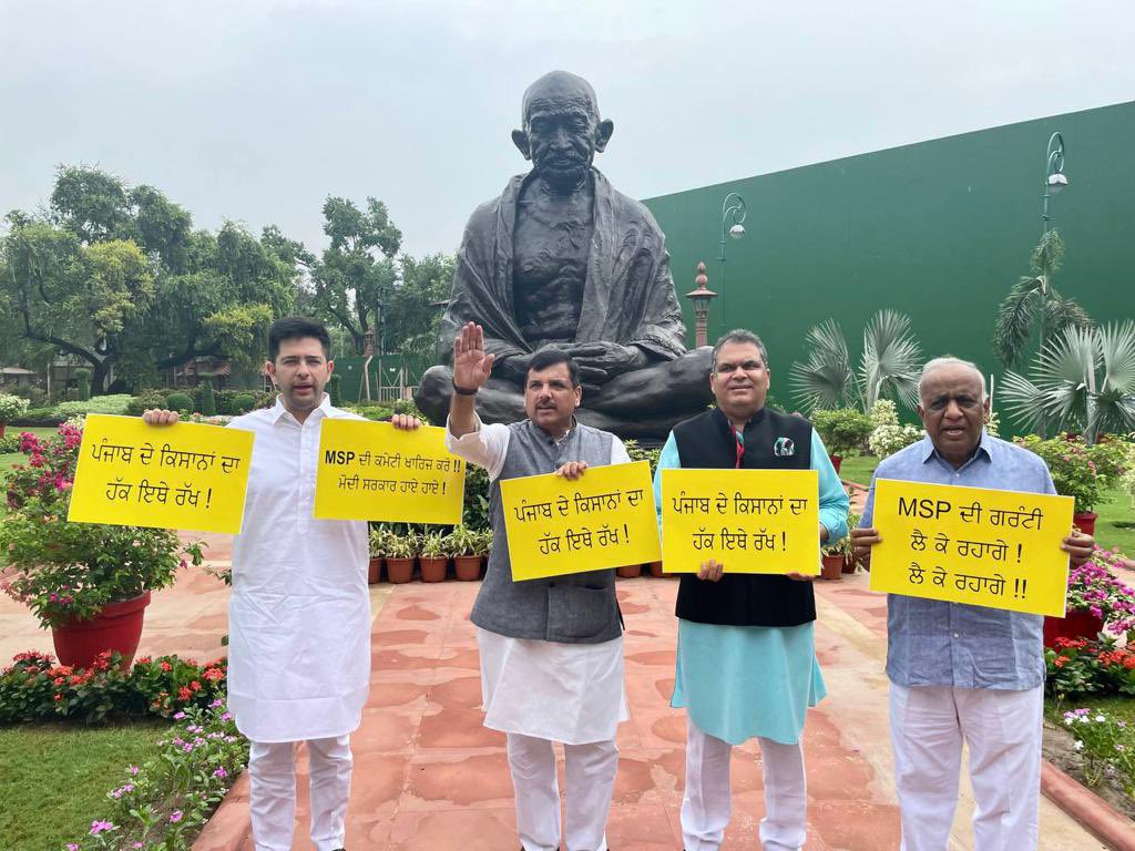 On the 3rd day of Monsoon Session AAP MP Raghav Chadha protested outside the Parliament regarding the MSP committee formed by the Centre Government Other AAP leaders including Sanjay Singh were also present