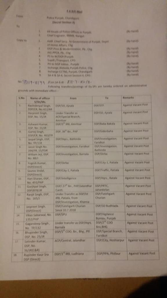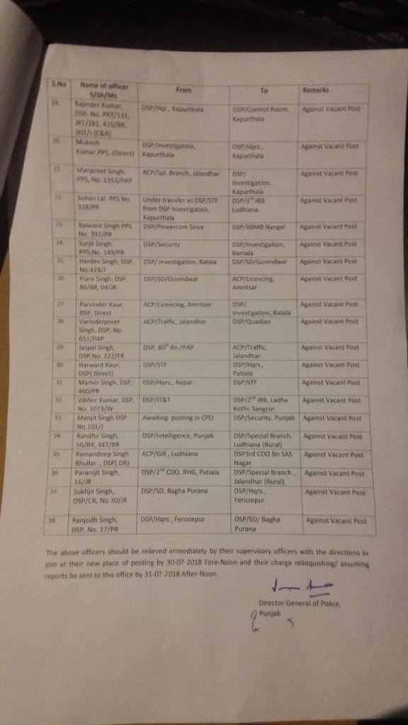38 DSPs transferred in Punjab July 28, 2018 - PatialaPolitics SHARE ON TwitterFacebookGoogle+BufferLinkedInPin It Post Views: 0