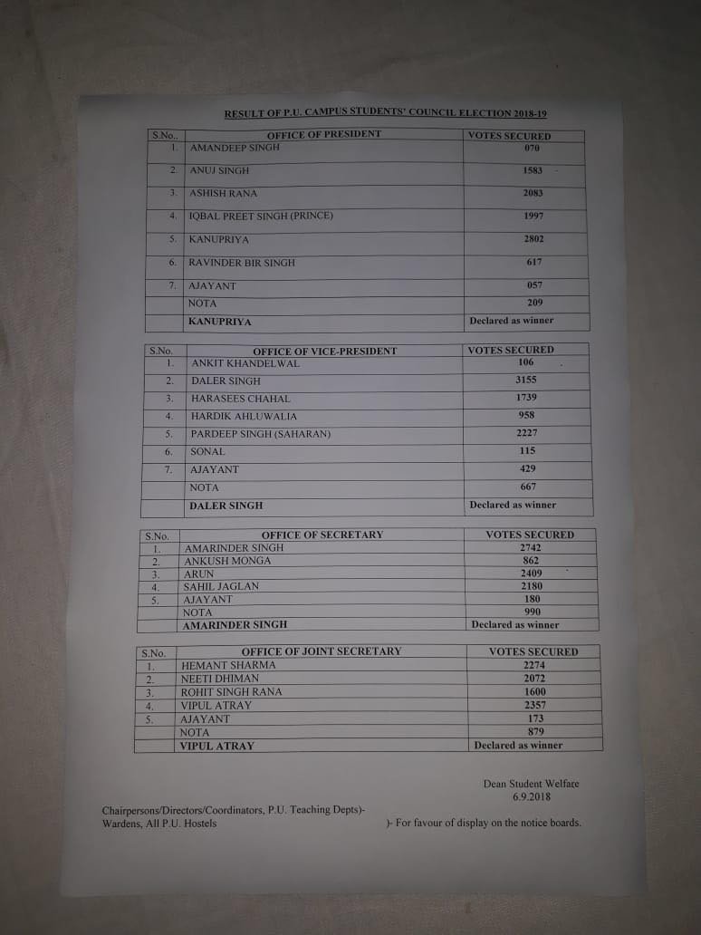ਕਨੂੰਪ੍ਰਿਆ ਨੂੰ 2802 ਵੋਟਾਂ, ਏ.ਬੀ.ਵੀ.ਪੀ ਦੇ ਉਮੀਦਵਾਰ ਅਸ਼ੀਸ਼ ਰਾਣਾ ਨੂੰ 2083 ਵੋਟਾਂ, ਐਸ.ਓ.ਆਈ. ਦੇ ਉਮੀਦਵਾਰ ਇਕਬਾਲਪ੍ਰੀਤ ਸਿੰਘ ਨੂੰ1987 ਵੋਟਾਂ ਤੇ ਐਨ.ਐਸ.ਯੂ.ਆਈ ਦੇ ਉਮੀਦਵਾਰ ਅਨੁਜ ਸਿੰਘ ਨੂੰ 1583 ਵੋਟਾਂ ਮਿਲੀਆਂ। ਕਨੂਪ੍ਰੀਆ ਨੇ ਕੁੱਲ 719 ਵੋਟਾਂ ਦੇ ਫਰਕ ਨਾਲ ਏ.ਬੀ.ਵੀ.ਪੀ ਤੇ ਐਸ.ੳ.ਆਈ ਤੋਂ ਜਿੱਤ ਹਾਸਲ ਕੀਤੀ।