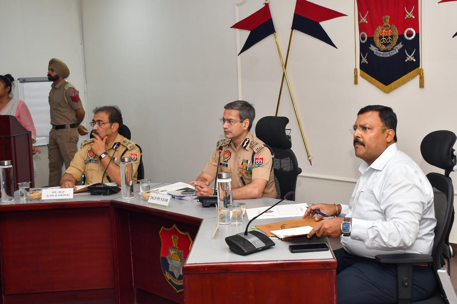 The DGP was chairing a state-level Law & Order Meeting with all Range DIGs, SSPs, and CPs at Maharaja Ranjit Singh-Punjab Police Academy (MRS-PPA), Phillaur, to review the drug law enforcement in ongoing Yudh Nashian Virudh, the law & order situation and internal security scenario in the state. Special DGP Law and Order Arpit Shukla, Special DGP Intelligence Praveen Sinha, Director PPA Phillaur Anita Punj, ADGP ANTF Nilabh Kishore, ADGP AGTF Promod Ban and ADGP Counter Intelligence (CI) Amit Prasad and IGP Headquaters Dr Sukhchain Singh Gill also attended the meeting.