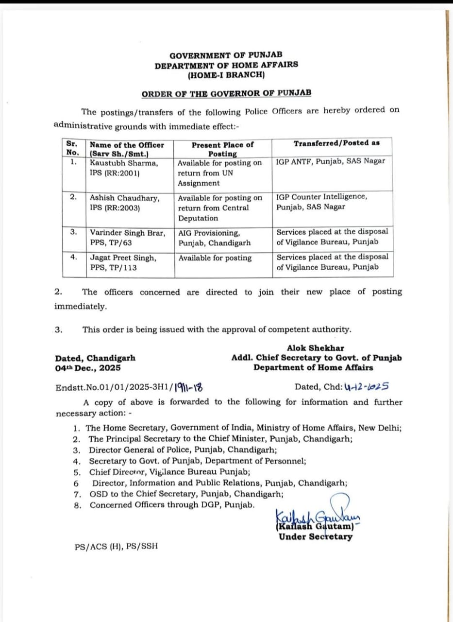 4 IPS/PPS Officer’s Transferred in Punjab December 4, 2025 - PatialaPolitics 4 IPS/PPS Officer’s Transferred in Punjab SHARE ON TwitterFacebookGoogle+BufferLinkedInPin It Post Views: 0