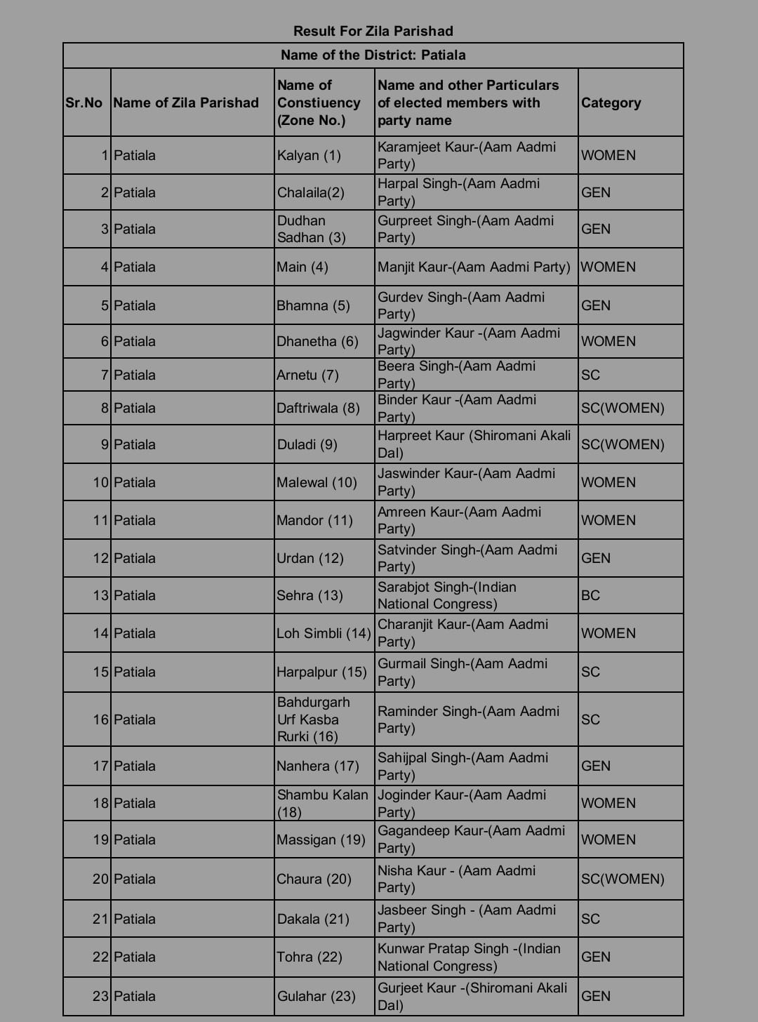 Patiala: Zila Parishad Election result 2025 December 18, 2025 - PatialaPolitics Patiala: Zila Parishad Election result 2025 SHARE ON TwitterFacebookGoogle+BufferLinkedInPin It Post Views: 0