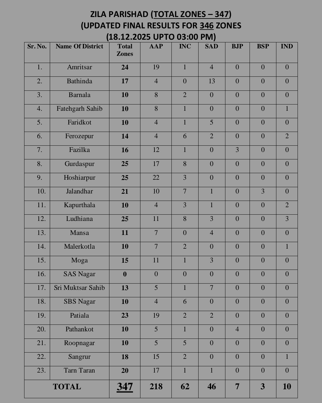 The State Election Commission, Punjab today declared the results of general elections to elect the members from 346 zones of 22 Zila Parishads and from 2834 zones of 153 Panchayat Samitis. In this regard, AAP won 218 zones, INC won 62 zones, SAD won 46 zones, BJP won 7 zones, BSP won 3 zones and IND won 10 zones in Zila Parishad Elections.