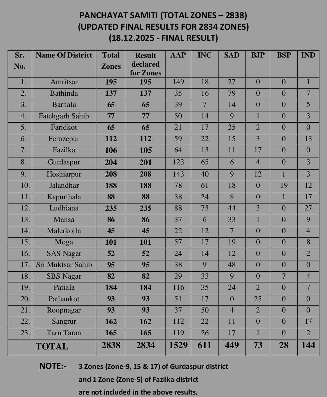 Similarly, In Panchayat Samiti Elections, AAP won 1529 zones, INC won 611 zones, SAD won 449 zones, BJP won 73 zones, BSP won 28 zones and IND won 144 Zones. District wise break-up of Zila Parishad and Panchayat Samiti Results are attached.