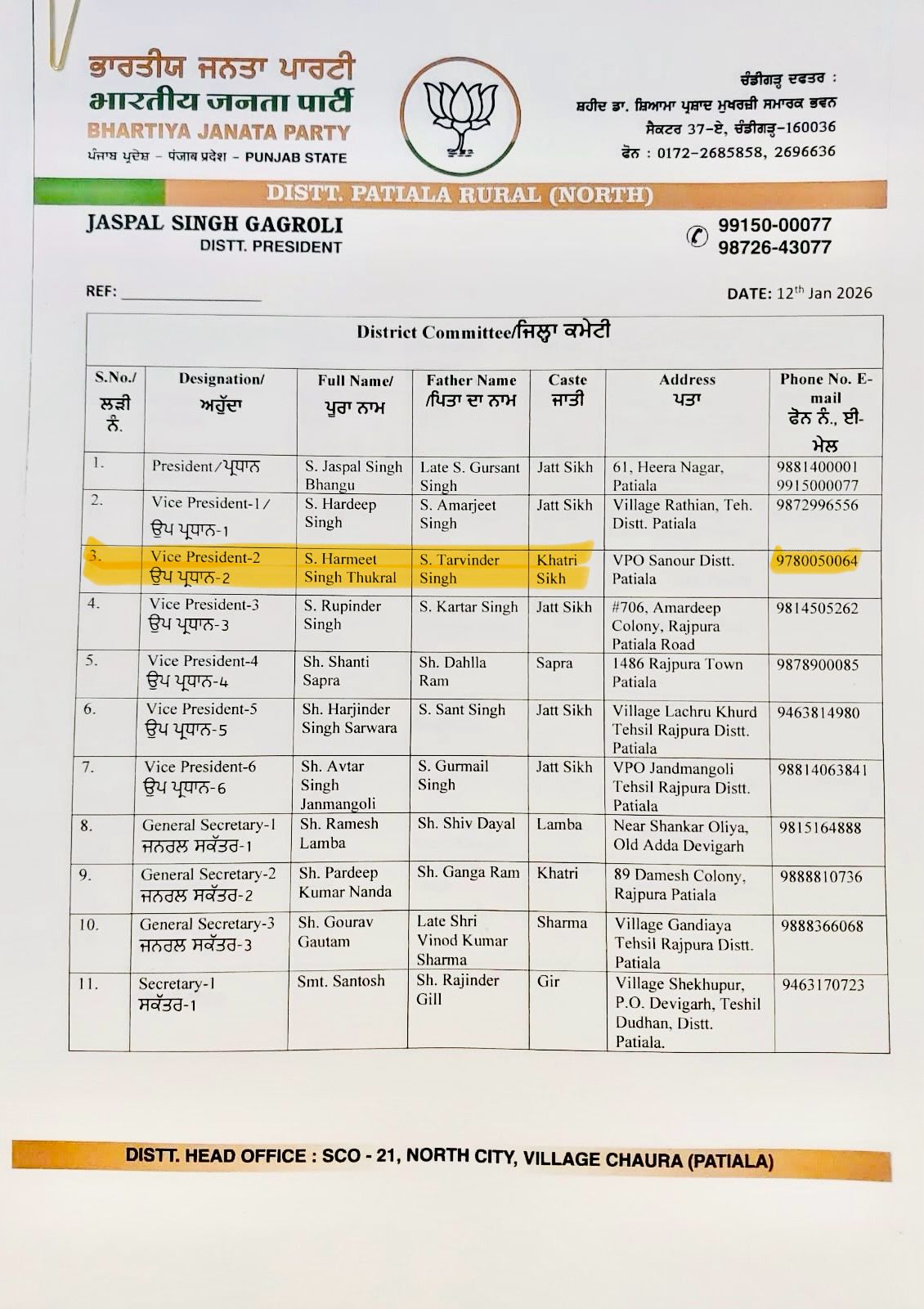 ਭਾਰਤੀ ਜਨਤਾ ਪਾਰਟੀ (ਭਾਜਪਾ) ਨੇ ਸੰਗਠਨਾਤਮਕ ਢਾਂਚੇ ਨੂੰ ਮਜ਼ਬੂਤ ਕਰਦਿਆਂ ਜ਼ਿਲ੍ਹਾ ਪਟਿਆਲਾ ਰੂਰਲ (ਨਾਰਥ) ਦੀ ਨਵੀਂ ਜ਼ਿਲ੍ਹਾ ਕਮੇਟੀ ਦਾ ਰਸਮੀ ਐਲਾਨ ਕਰ ਦਿੱਤਾ ਹੈ। ਇਸ ਨਵੀਂ ਸੂਚੀ ਵਿੱਚ ਪਾਰਟੀ ਦੇ ਮਿਹਨਤੀ ਆਗੂ ਸ. ਹਰਮੀਤ ਸਿੰਘ ਠੁਕਰਾਲ ਨੂੰ ਅਹਿਮ ਜ਼ਿੰਮੇਵਾਰੀ ਸੌਂਪਦਿਆਂ ਜ਼ਿਲ੍ਹਾ ਵਾਈਸ ਪ੍ਰਧਾਨ (Vice President) ਨਿਯੁਕਤ ਕੀਤਾ ਗਿਆ ਹੈ।