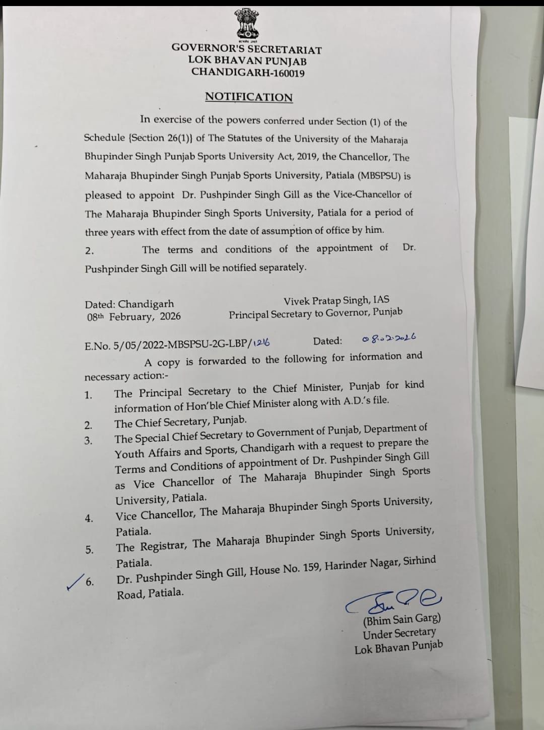 Patiala, February 8, 2026 — The Governor of Punjab, through the Governor’s Secretariat, Lok Bhavan Punjab, Chandigarh, has announced the appointment of Dr. Pushpinder Singh Gill as the Vice-Chancellor of The Maharaja Bhupinder Singh Punjab Sports University (MBSPSU), Patiala, for a tenure of three years with effect from the date of assumption of office.