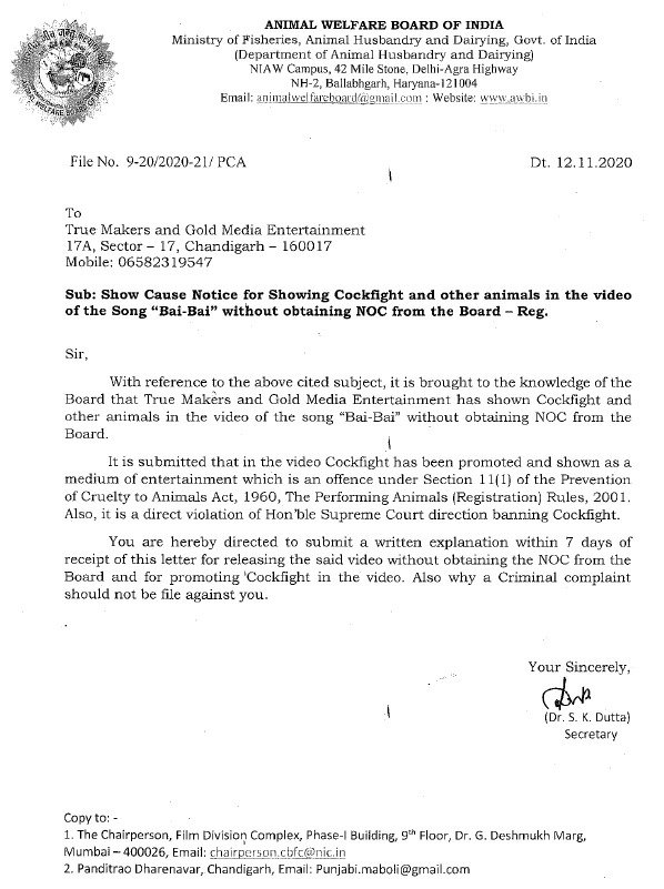 Sidhu Moosewala’s new song ‘Bai Bai’ shows cock fight post which Animal Welfare Board of India has sent notice to production house and singer. They are directed to file written reply within next 7 days.