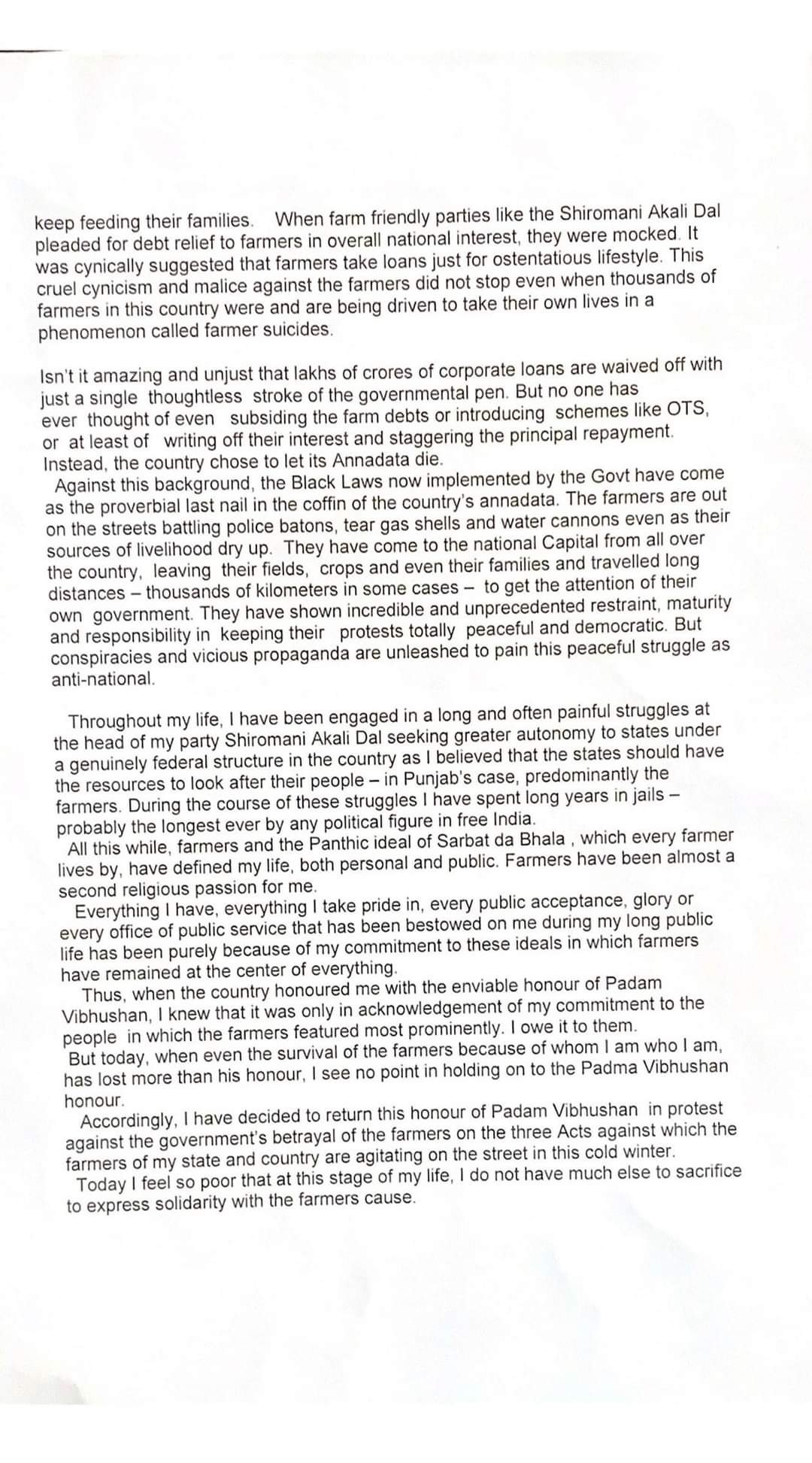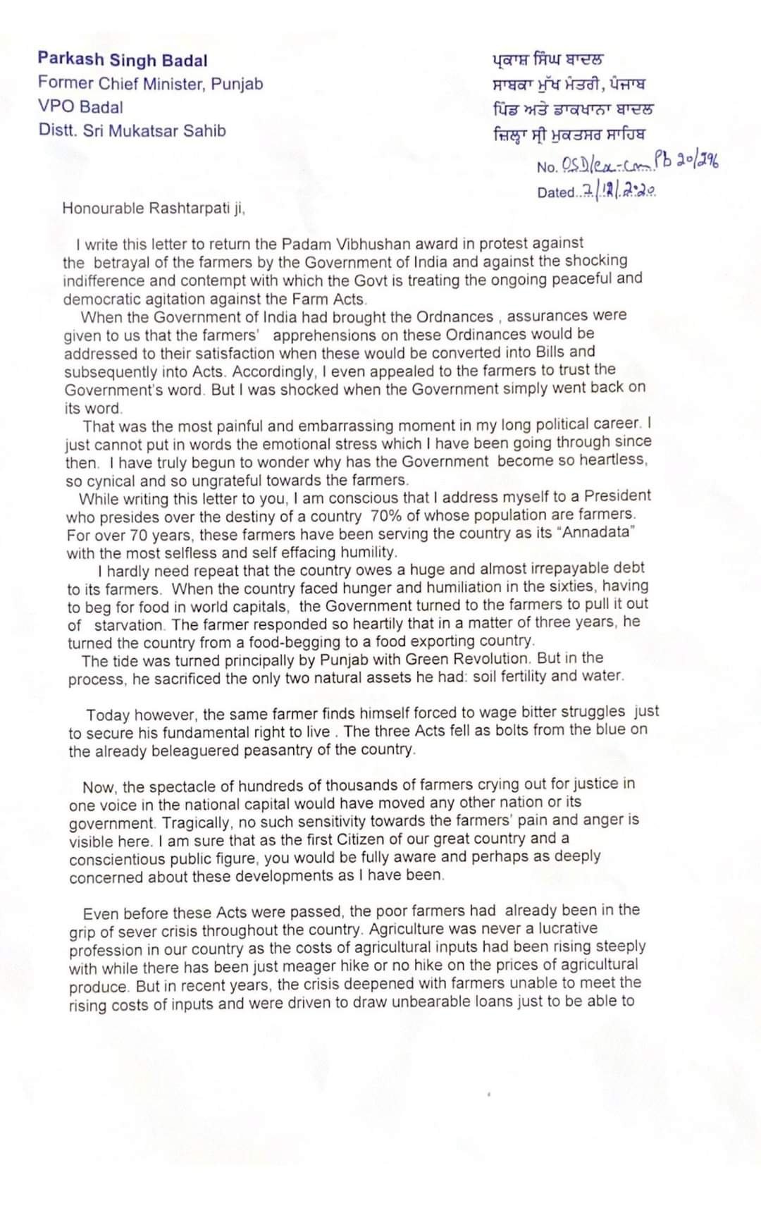 Parkash Singh Badal returns Padam Vibhushan in protest against ‘betrayal of farmers’