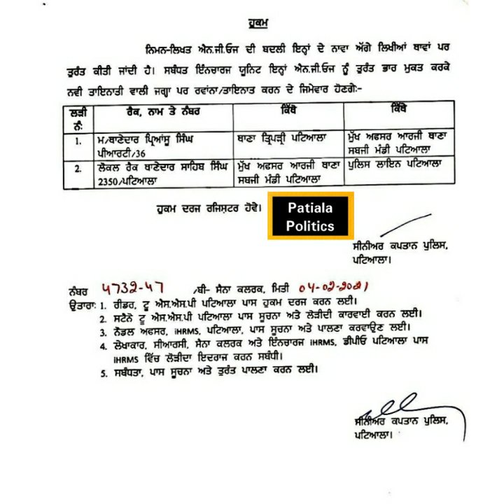 Patiala Police Transfer:Priyanshu Singh posted as SHO Sabji Mandi February 4, 2021 - PatialaPolitics SHARE ON TwitterFacebookGoogle+BufferLinkedInPin It Post Views: 0