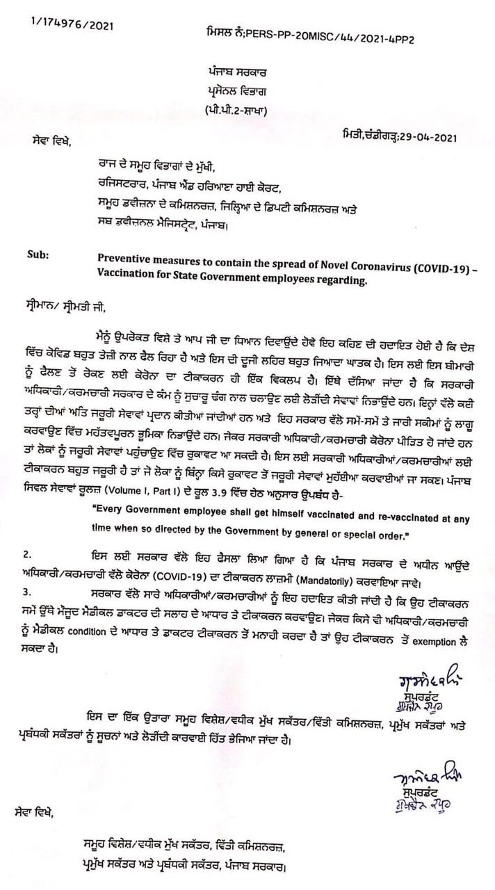 Covid Vaccination:Compulsory for Punjab Govt employees April 29, 2021 - PatialaPolitics SHARE ON TwitterFacebookGoogle+BufferLinkedInPin It Post Views: 0