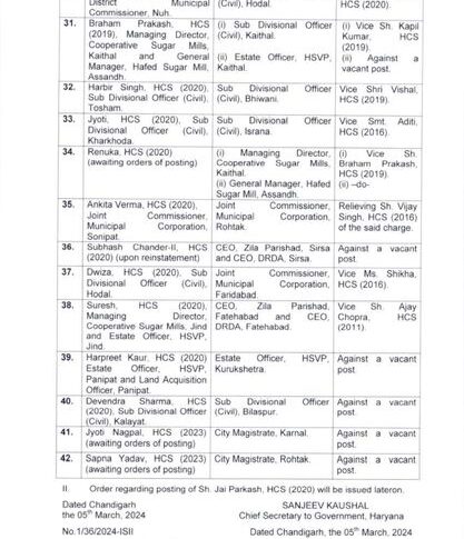 Haryana News Haryana Govt issues posting/transfer orders of 42 IAS/HCS officers with immediate effect. March 5, 2024