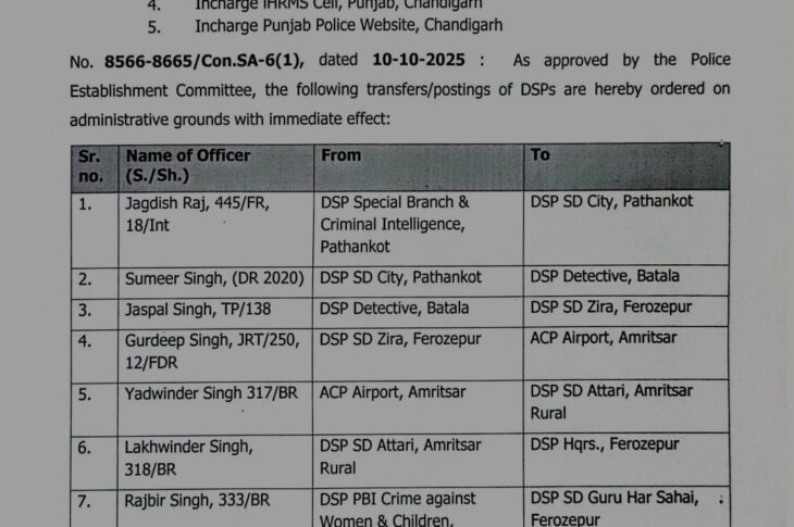 Featured About Patiala Headlines Patiala News Punjab News Transfers in Punjab 53 DSPs Transferred in Punjab October 10, 2025