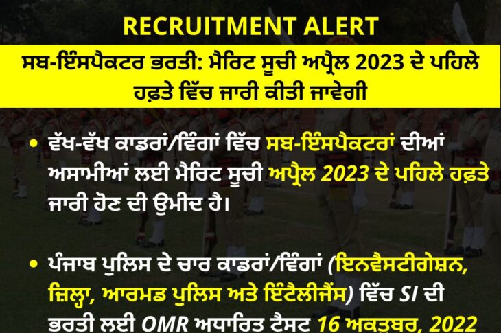 Featured Headlines Punjab News Punjab Police News PUNJAB SUB-INSPECTOR RECRUITMENT: MERIT LIST TO BE OUT IN 1st WEEK OF APRIL 2023 March 22, 2023