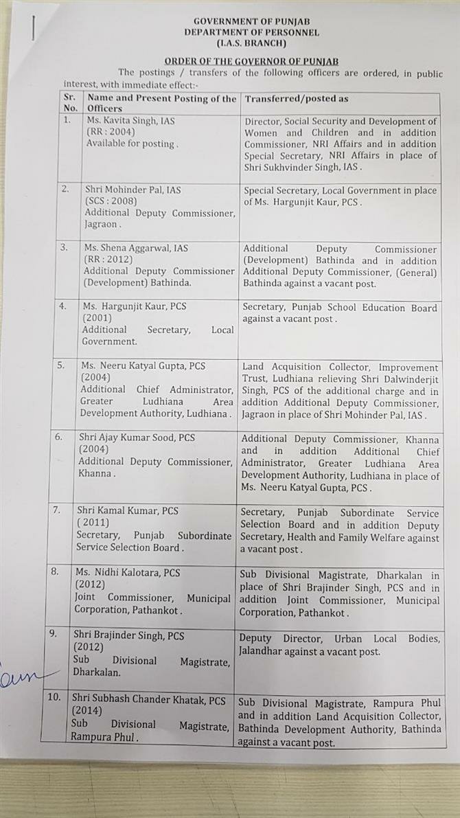 Featured Headlines Punjab News Transfers in Punjab Punjab Transfers – 3 IAS, 11 PCS officers transferred October 24, 2017