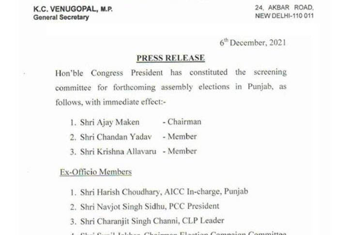 Featured Headlines Patiala News Punjab Congress News Punjab News Congress forms screening committee for Punjab 2022 polls December 6, 2021