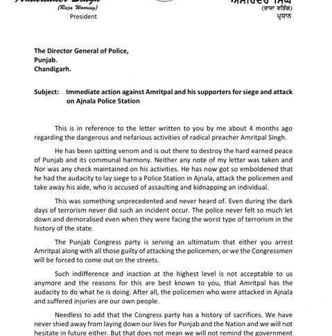 Featured Headlines Punjab Congress News Punjab News Congress letter to DGP Punjab to take action the Ajnala incident March 1, 2023