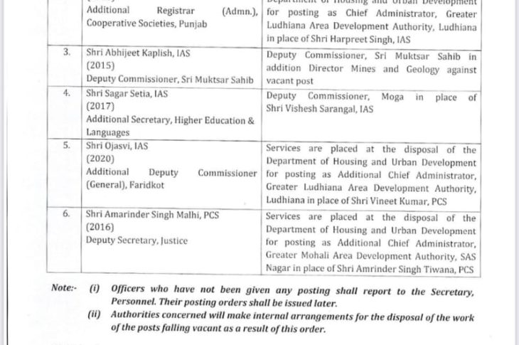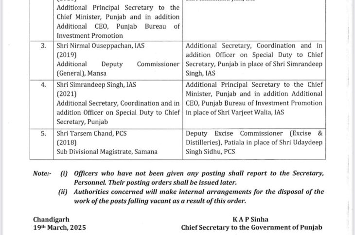 Featured Headlines Punjab News Transfers in Punjab 5 IAS/PCS Officers Transferred in Punjab March 19, 2025