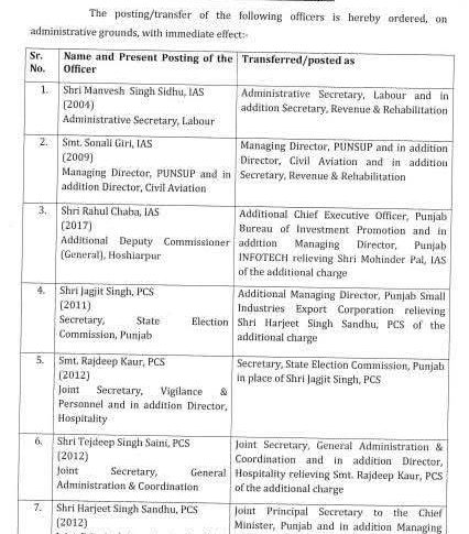 Featured Headlines Punjab News Transfers in Punjab 7 IAS/PCS Officers Transferred in Punjab March 12, 2025