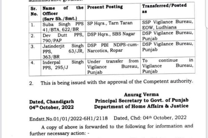 About Patiala Featured Headlines Punjab News Transfers in Punjab 4 PPS officers Transferred in Punjab October 4, 2022